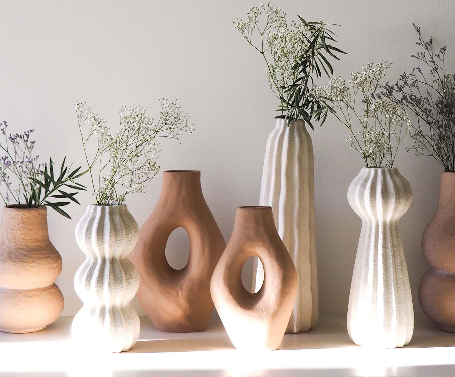 Jarrón decorativo Andrea House modelo Duala fabricado en cerámica con acabado terracota, diseñado para aportar calidez y estilo natural a la decoración del hogar. Su estética orgánica y tono terroso lo convierten en un complemento ideal para interiores de estilo mediterráneo, rústico o contemporáneo, perfecto para flores secas, ramas decorativas o como pieza escultórica independiente.