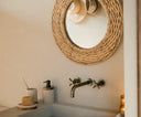 • Material mixto resistente: cuerpo en poliresina que combina durabilidad con acabado estético y base de acacia tratada para humedad del baño.