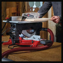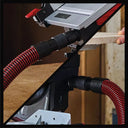Un láser de línea de corte integrado marca el corte. A la izquierda y a la derecha se sitúa un apoyo de pieza de trabajo para poder mecanizar piezas de trabajo más largas sin problemas. El dispositivo de sujeción ofrece una seguridad adicional con la que se pueden fijar los materiales de trabajo. Las conexiones de aspiración integradas de Ø 36 mm, a las que, por ejemplo, se pueden conectar todas las aspiradoras en seco y húmedo de Einhell, garantizan un trabajo limpio.