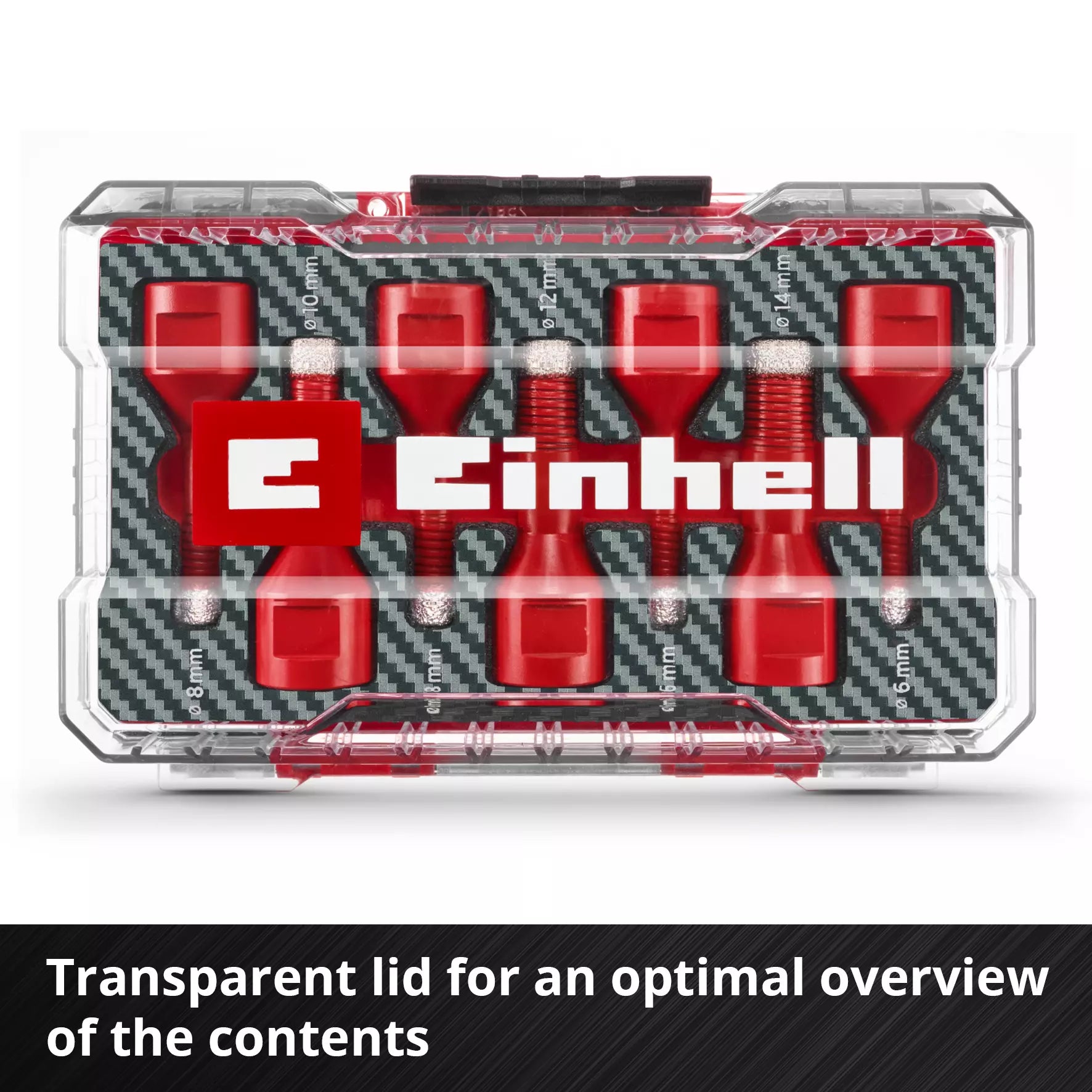 El Juego de Brocas M-CASE LS de 7 piezas de Einhell está diseñado para perforar materiales como porcelánico, azulejos y piedra natural. Estas brocas de diamante ofrecen una larga vida útil y permiten cortes en seco sin necesidad de refrigeración adicional.