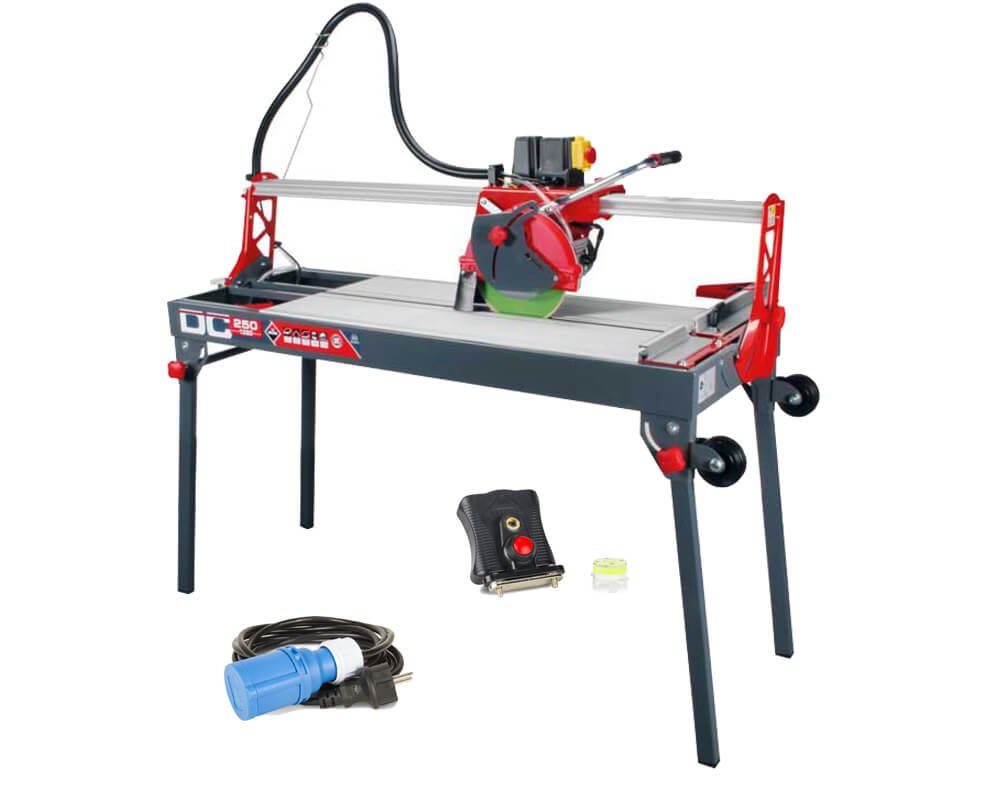 La mesa cortadora eléctrica DC-250 1200 de RUBI, es una cortadora eléctrica de cabezal móvil, diseñada para un corte general de baldosa cerámica, para el corte de azulejos tipo BIII y gres esmaltado. Ademas esta equipada con un conjunto de motor de transmisión directa de 1,5 CV de potencia y protector térmico.